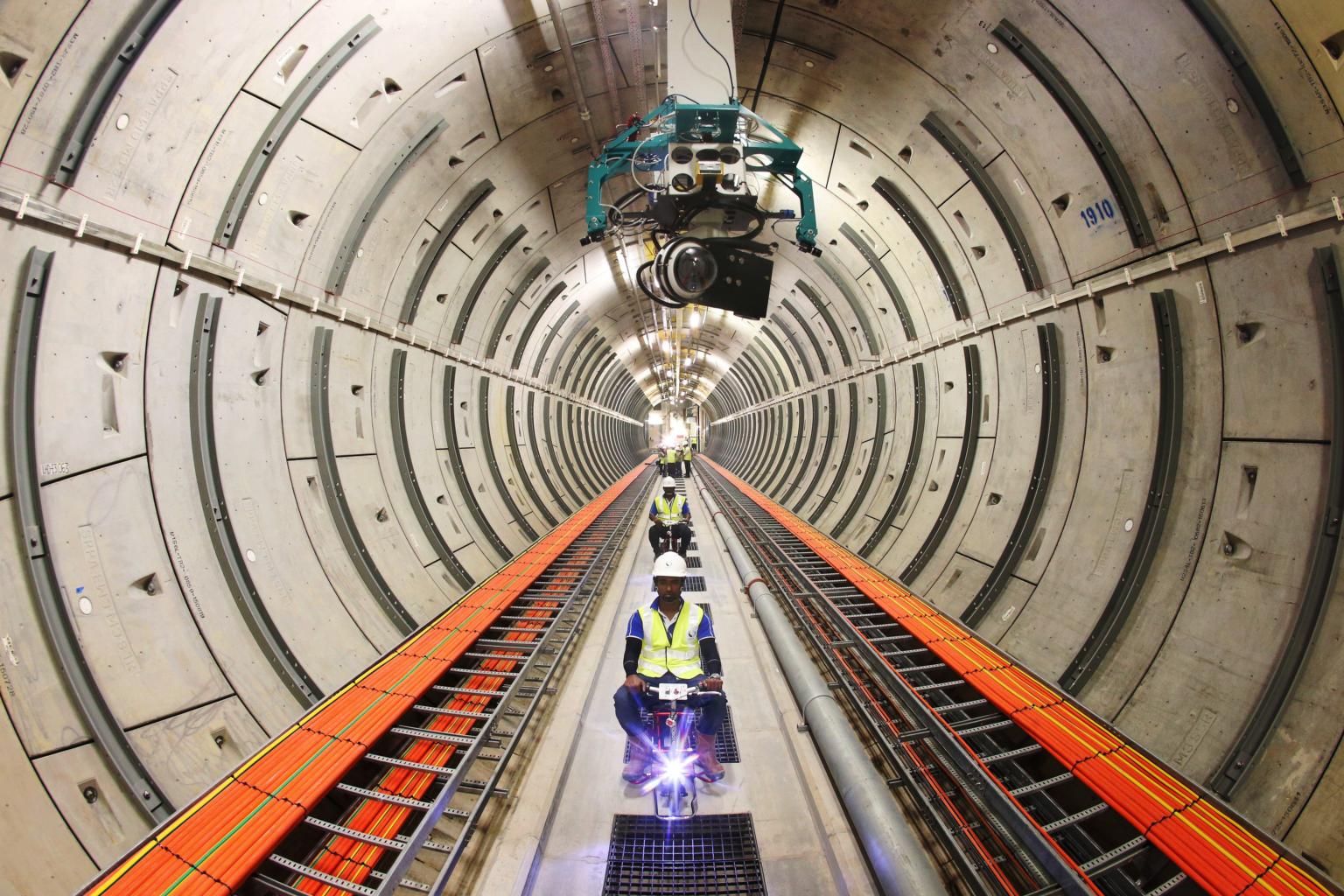SP Group staff ride electric bicycles in the tunnel network of the Underground Transmission Cable Tunnel Project on Dec 19, 2017.