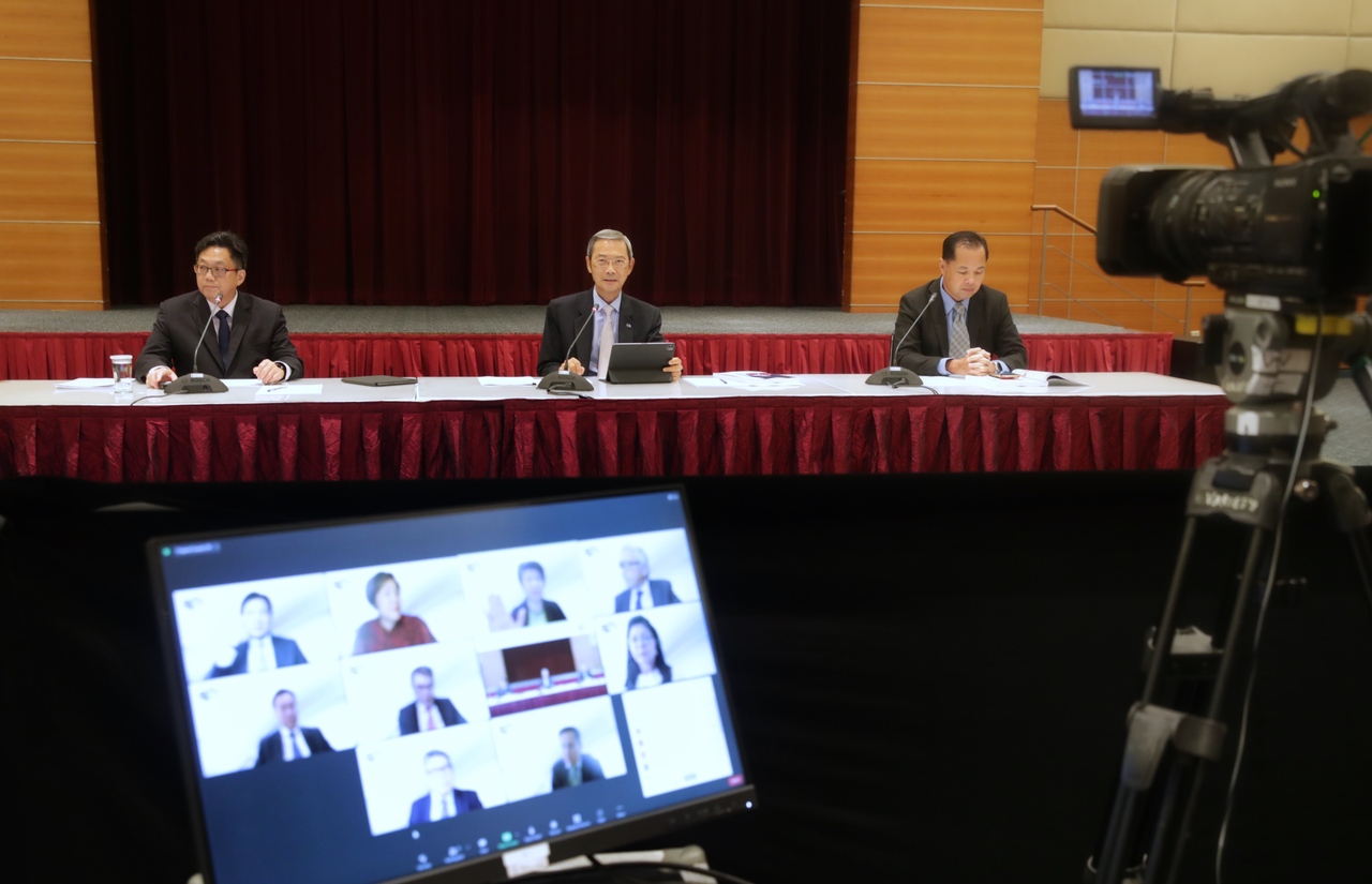 (From left) SPH chief executive Ng Yat Chung, chairman Lee Boon Yang and chief financial officer Chua Hwee Song at the virtual 37th annual general meeting at the News Centre in Toa Payoh on Nov 18, 2021.