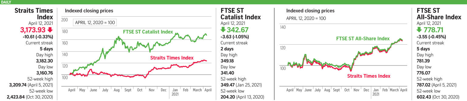 The Straits Times Index (STI) extended declines from last week, dropping 0.33 per cent to 3,173.93 yesterday, in line with the region.