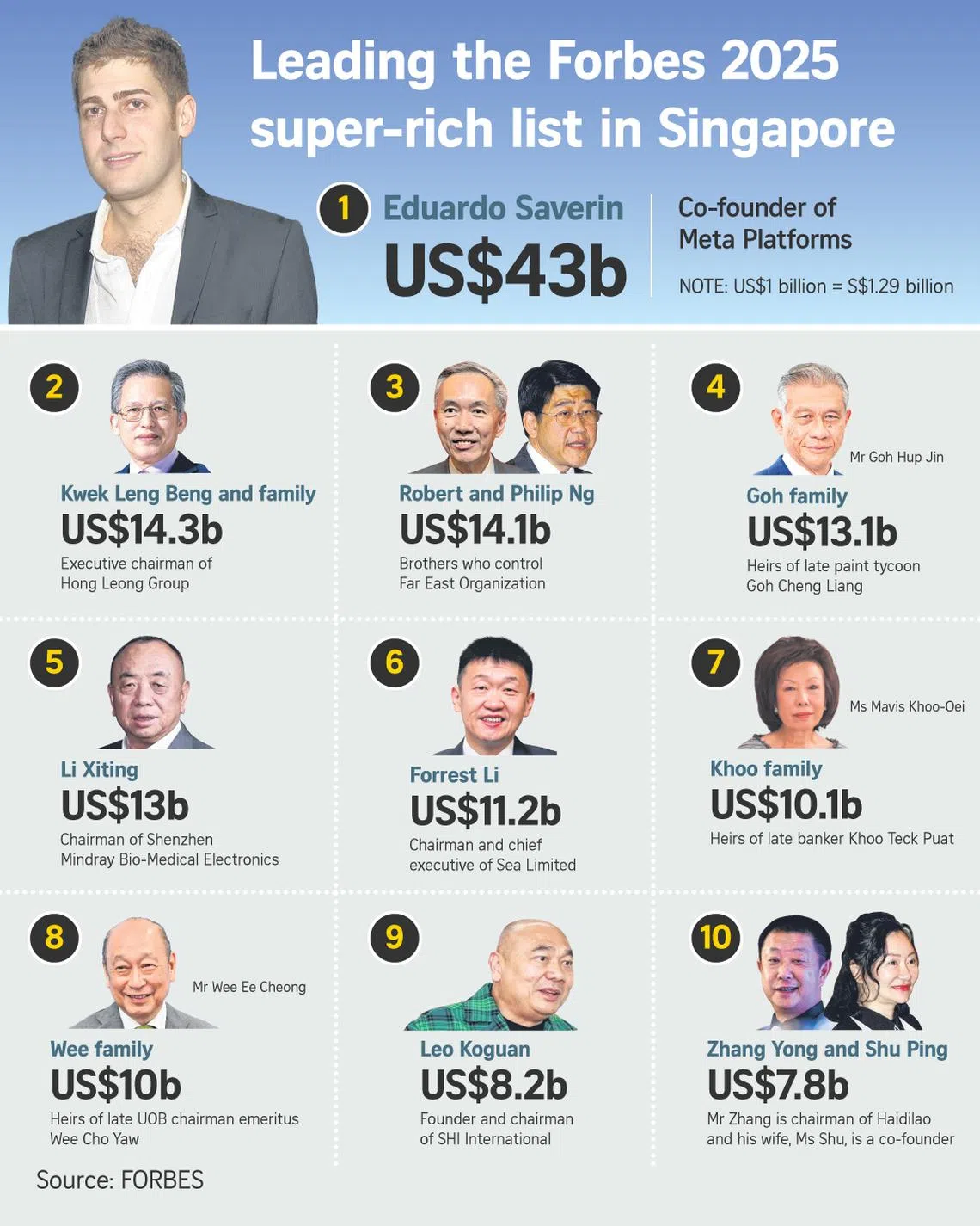 Mr Eduardo Saverin, co-founder of Meta Platforms, is the biggest dollar gainer in 2025, retaining pole position for the third consecutive year with a net worth of US$43 billion.