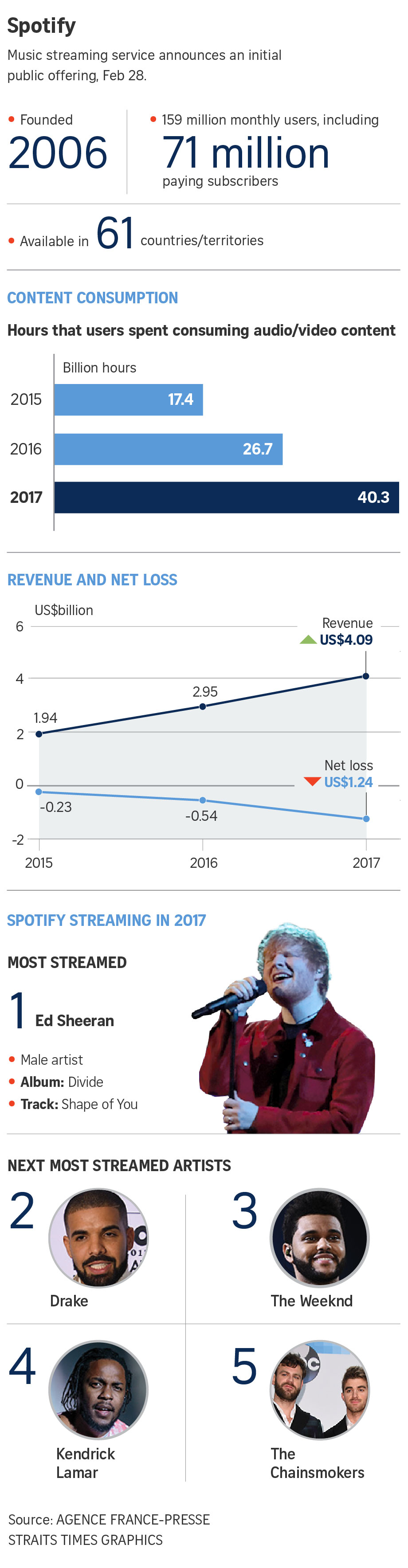Revenue for Spotify, which is present in more than 60 countries, came in at €4.09 billion (S$5.4 billion) in 2017, compared with €2.95 billion, a year earlier.