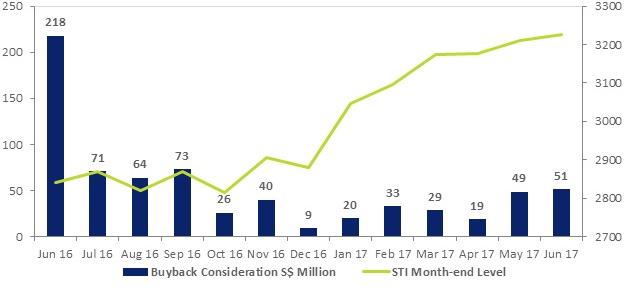 SINGAPORE - Share buyback consideration on the Singapore Stock Exchange in June was the highest since September last year (2016).