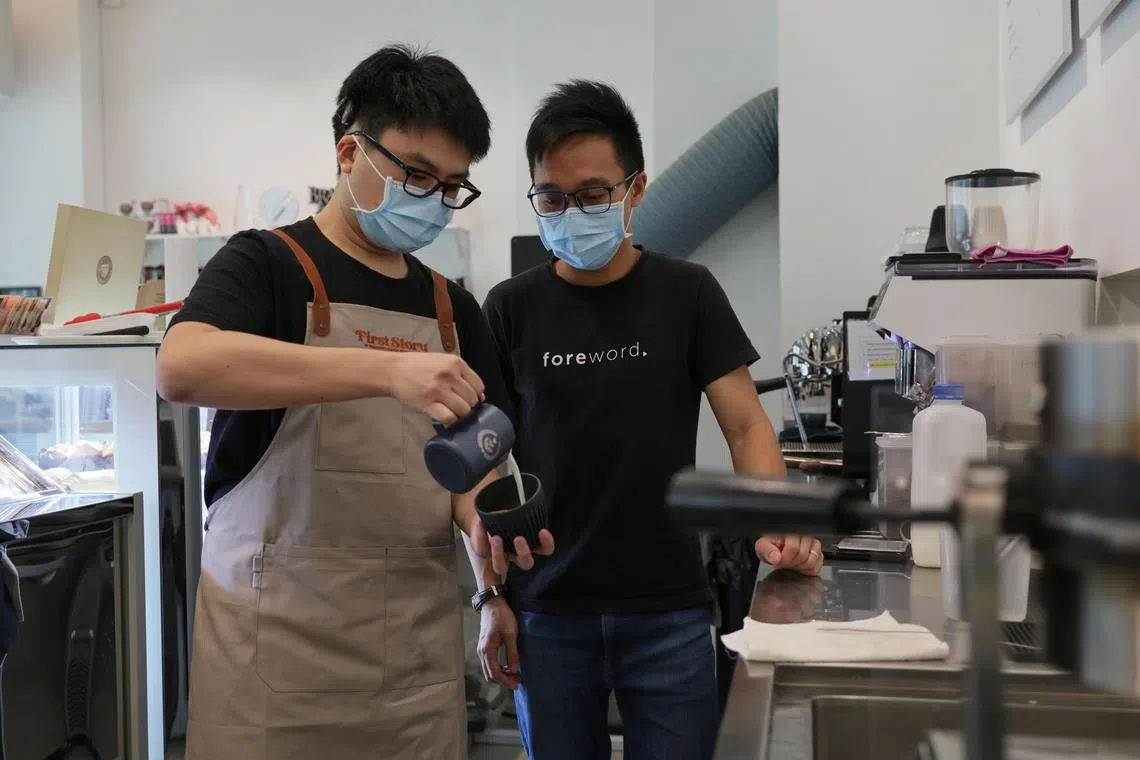 Foreword Coffee Roasters co-founder Lim Wei Jie (right) observing Mr Jerome Wong Ming Sen, 29, preparing a drink at First Story cafe by Foreword Coffee Roasters on Jan 16, 2024.