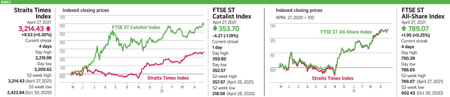 Singapore stocks closed higher on local heavyweights' earnings releases, with the benchmark Straits Times Index rising 9.53 points, or 0.3 per cent, to 3,214.43 yesterday.