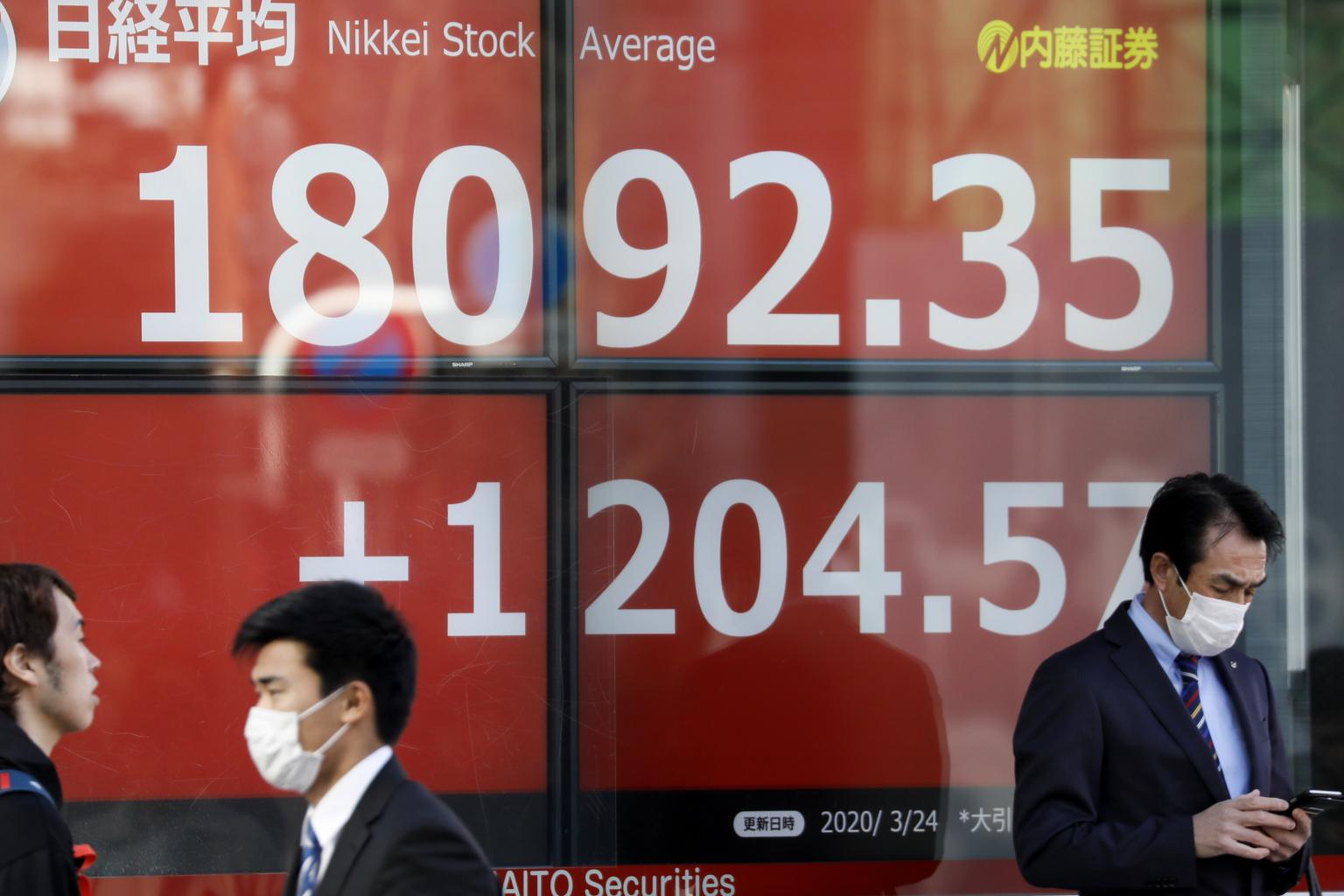 Pedestrians wearing masks walk past a display showing the closing information of Tokyo's Nikkei Stock Average in Tokyo on March 24, 2020.
