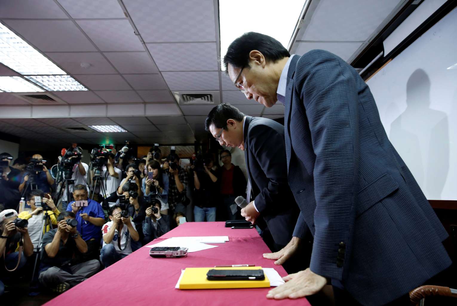 TransAsia Airways chairman Vincent Lin (center) bows his head during a news conference after its board had approved a move to wind down the company and that all flights would be suspended in Taipei on Nov 22, 2016.