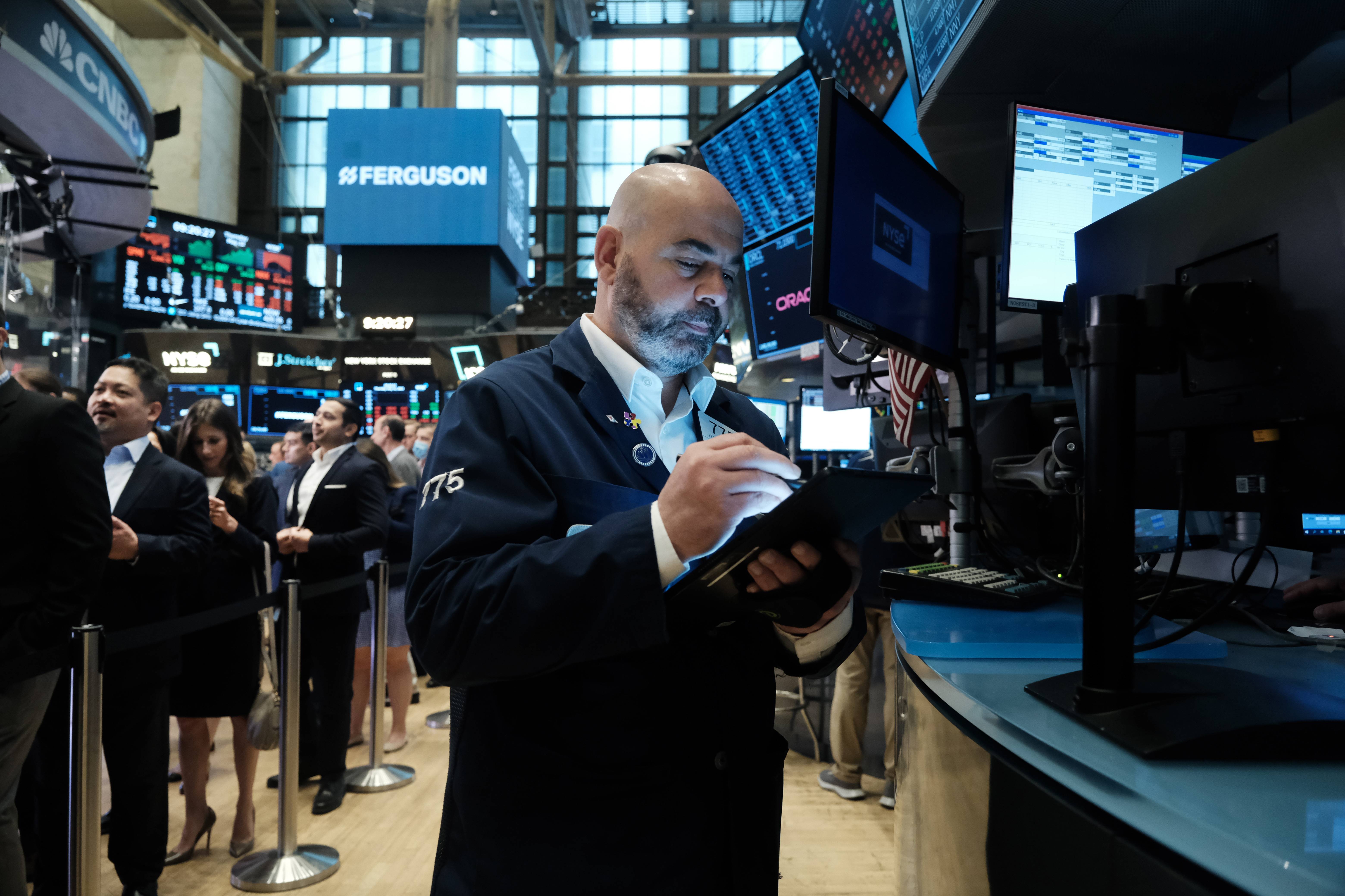 Traders work on the floor of the New York Stock Exchange.