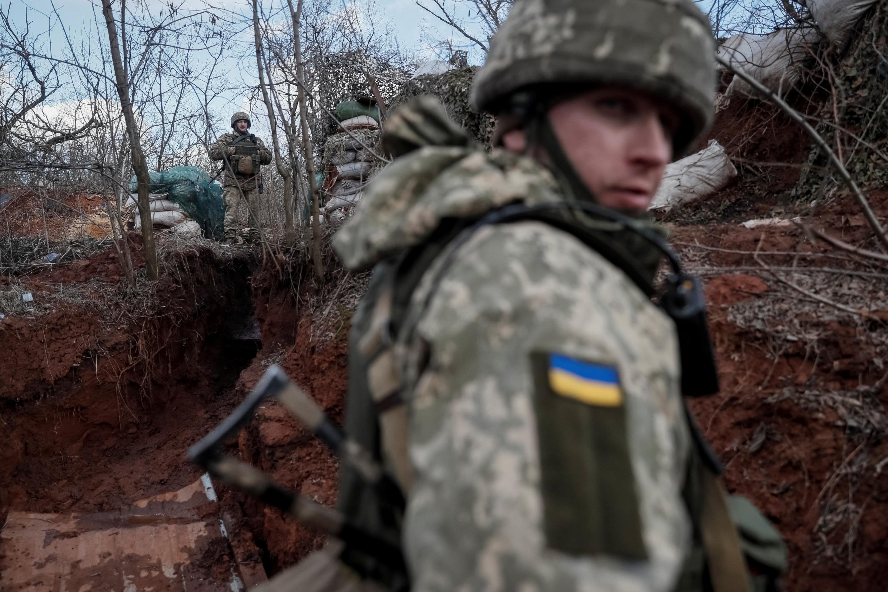 Ukrainian service members are seen on the front line near the city of Novoluhanske in the Donetsk region, Ukraine, on Feb 20, 2022.