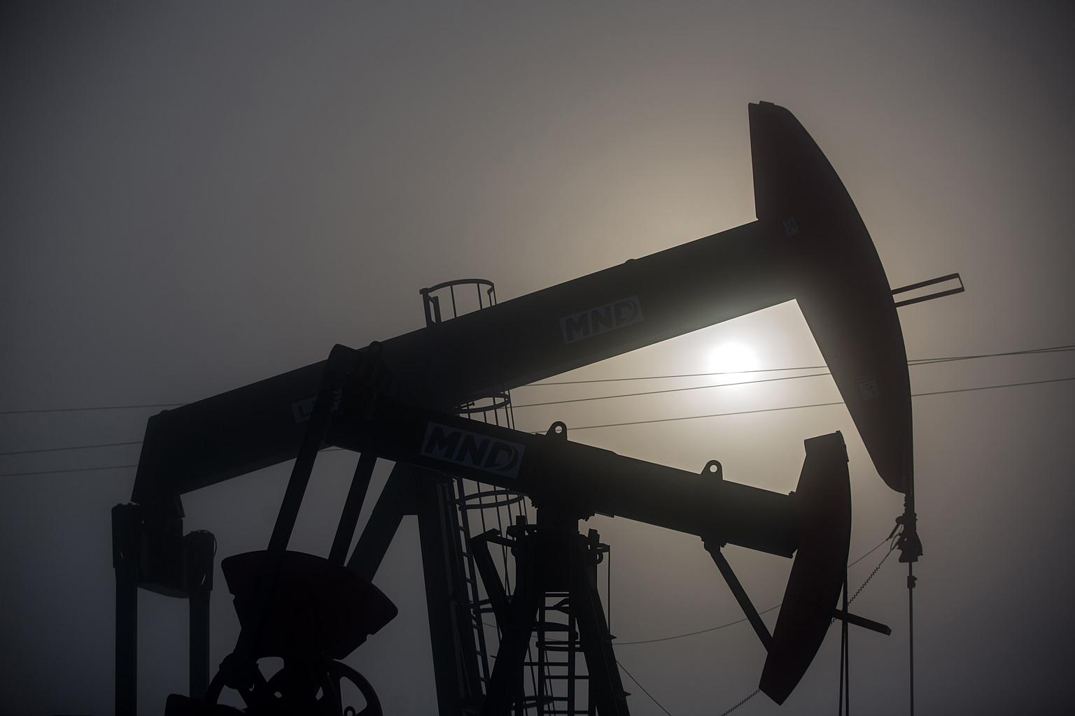 Pumping jacks, stand silhouetted against the sun at an oil plant in Damborice, Czech Republic.
