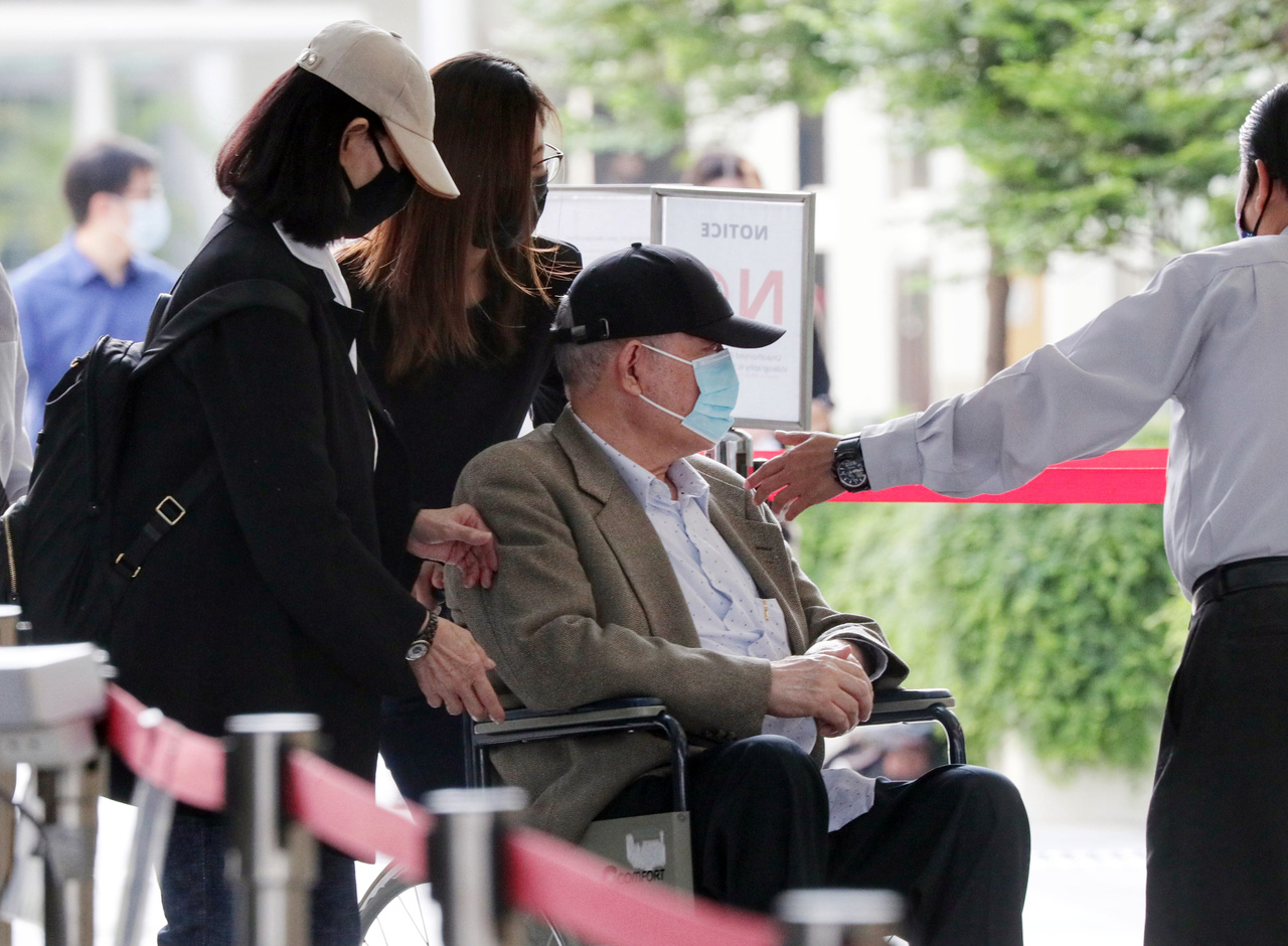 Hin Leong founder O.K. Lim arriving at the State Courts on April 30, 2021.