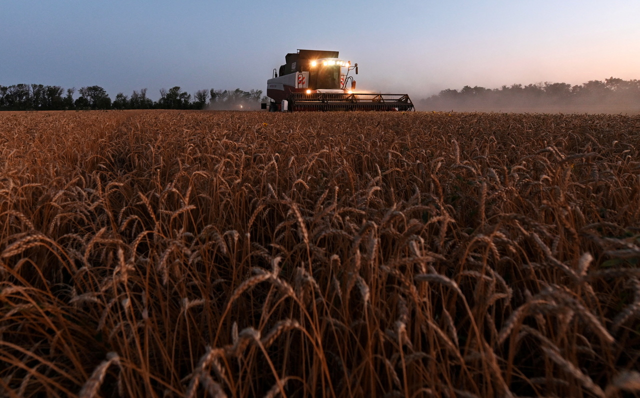 Wheat harvesting in a field near the village of Nedvigovka in Rostov region, Russia.