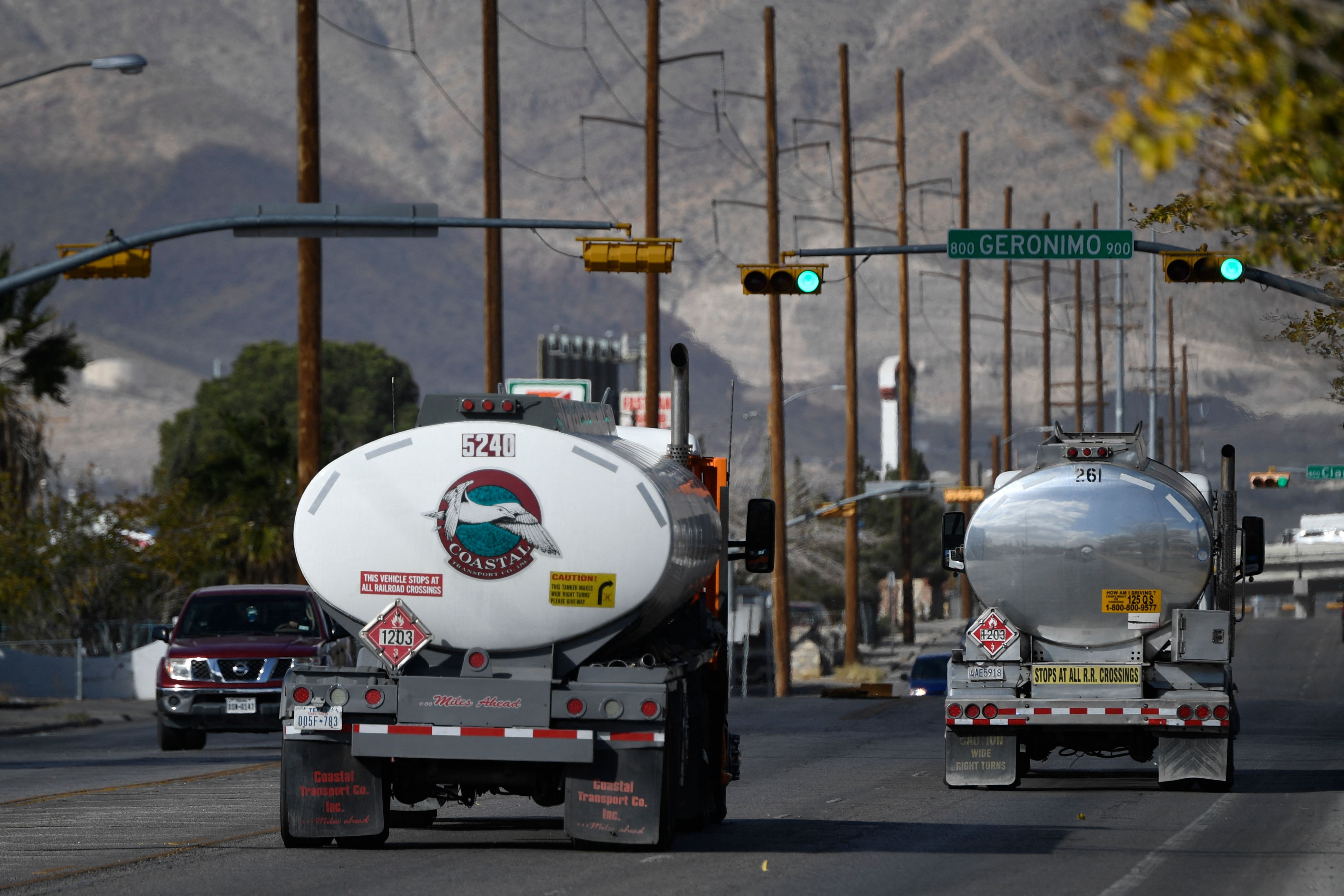 Tanker trucks drive down a road near an oil refinery in El Paso, Texas on Dec 10, 2021.