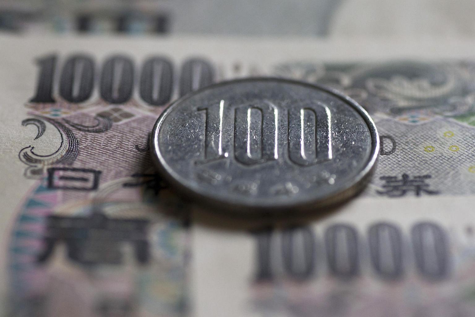A Japanese 100 yen coin and 10,000 yen banknotes are arranged for a photograph in Tokyo.