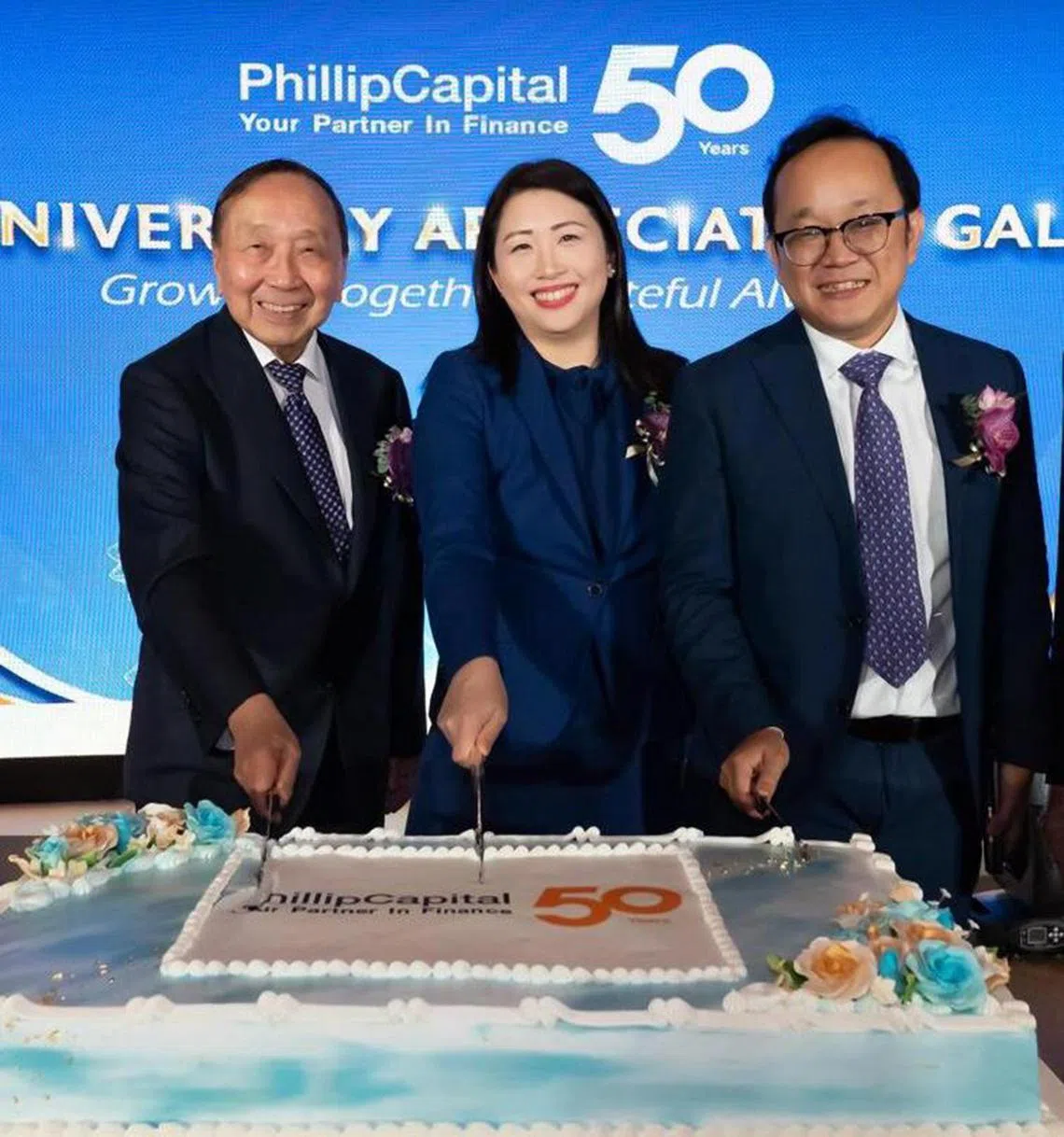 PhillipCapital executive chairman Lim Hua Min (left) and his son, Phillip Securities managing director Luke Lim, cutting PhillipCapital’s 50th birthday cake with Ms Gillian Tan, assistant managing director (development and international) and chief sustainability officer the Monetary Authority of Singapore.