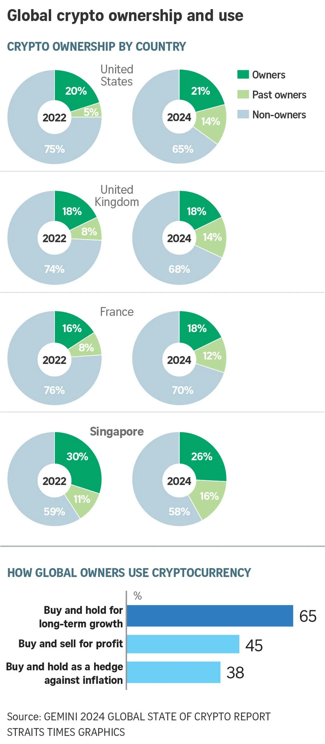 SINGAPORE - Cryptocurrency ownership has dipped in Singapore but remains steady in the United States, the United Kingdom and France, a report by exchange Gemini said.