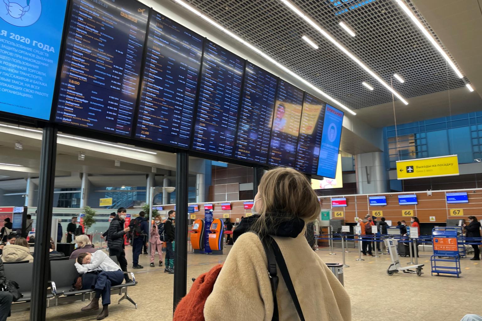 A passenger at Moscow's Sheremetyevo airport looking at the departures board after Russia closed its airspace to airlines from 36 countries, on Feb 28, 2022.