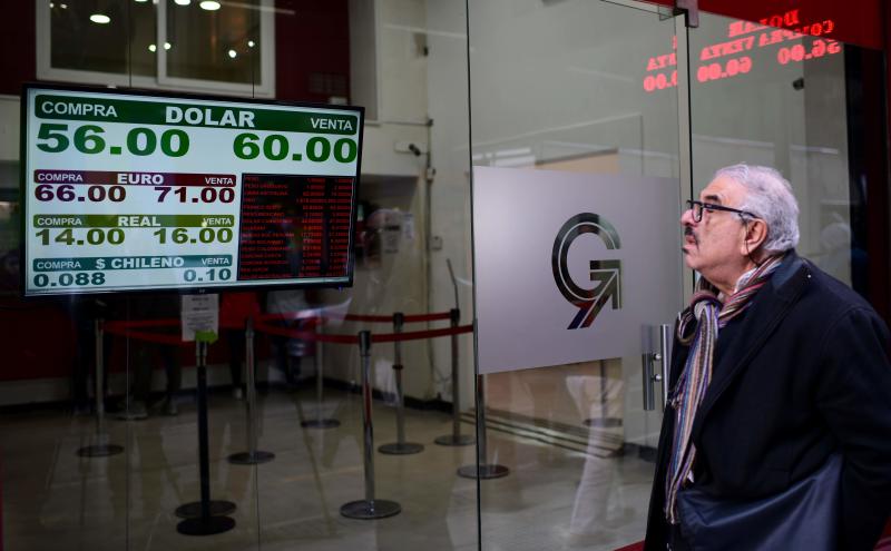 Currency exchange values are displayed on the buy-sell board of a bureau de exchange in Buenos Aires, on Aug 12, 2019.