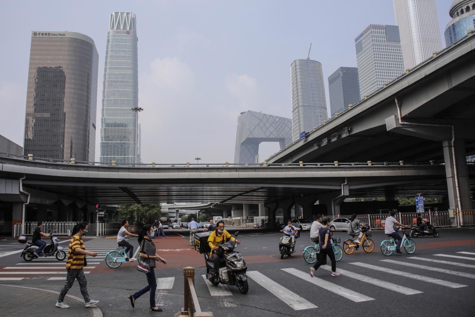 People walk in the central business district in Beijing on Sept 14, 2020.