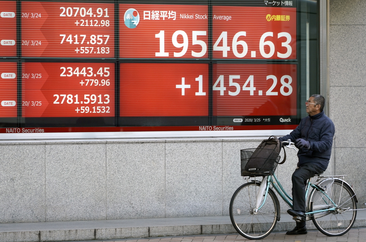 A man sitting on a bicycle looks at a stock market indicator board in Tokyo, Japan, on March 25, 2020.