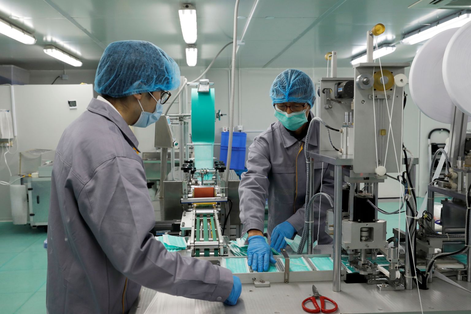 Workers on a production line for prototype face masks at a factory in Hong Kong on Feb 19, 2020.