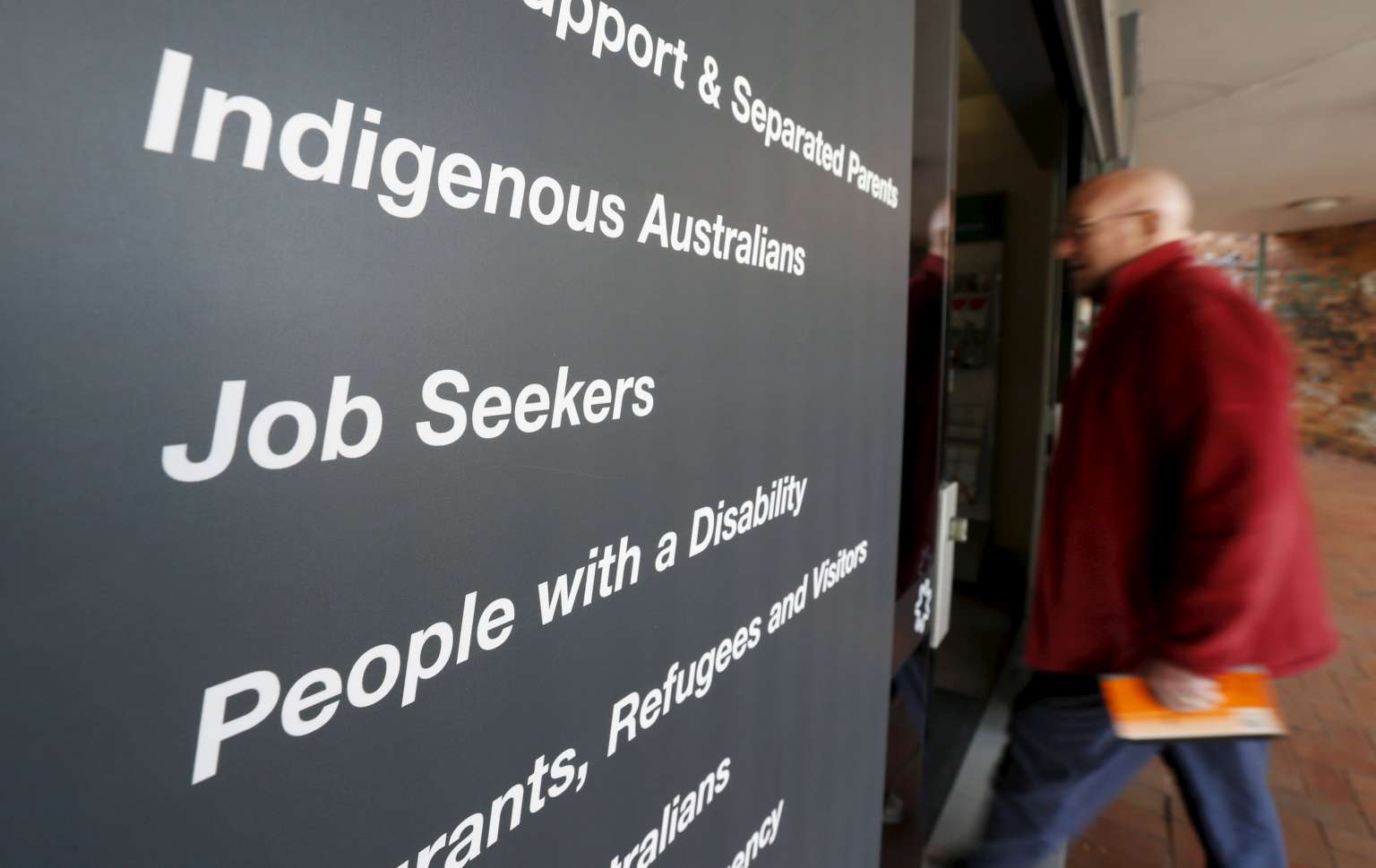 A man walking into a Centrelink, part of the Australian government's department of human services where job seekers search for work, in a Sydney suburb.