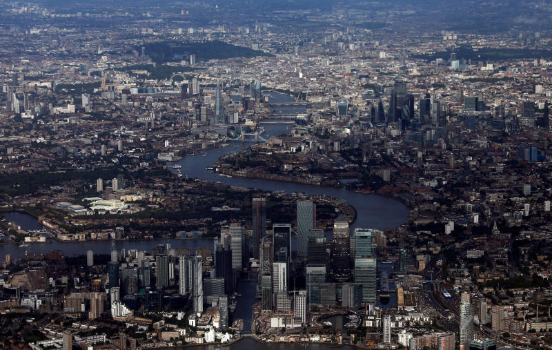 A photo taken on Aug 8, 2019 shows an aerial view of Canary Wharf and the City of London financial district in London.