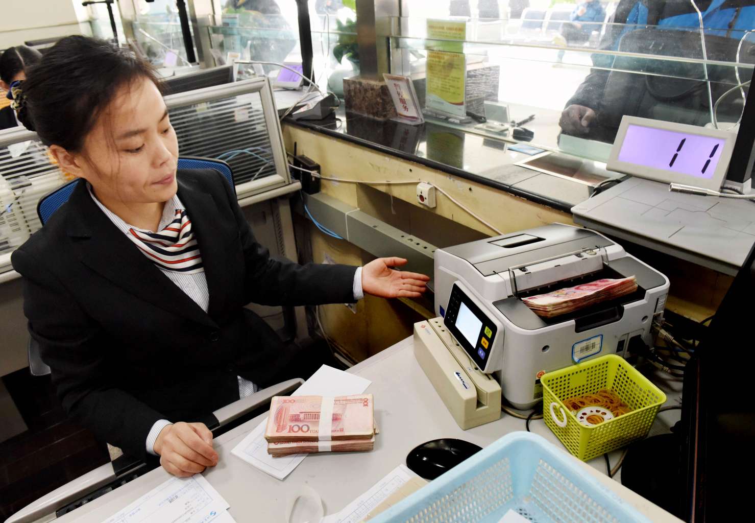 An employee counting 100-yuan notes at a bank in Lianyungang on Jan 7.