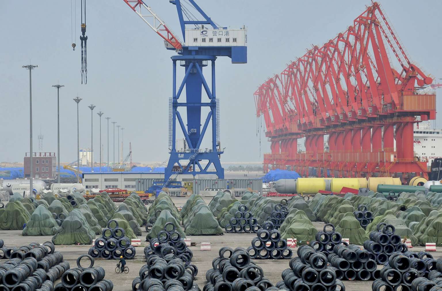 A worker rides his bicycle past piles of steel coils for export at a port in Yingkou, China.