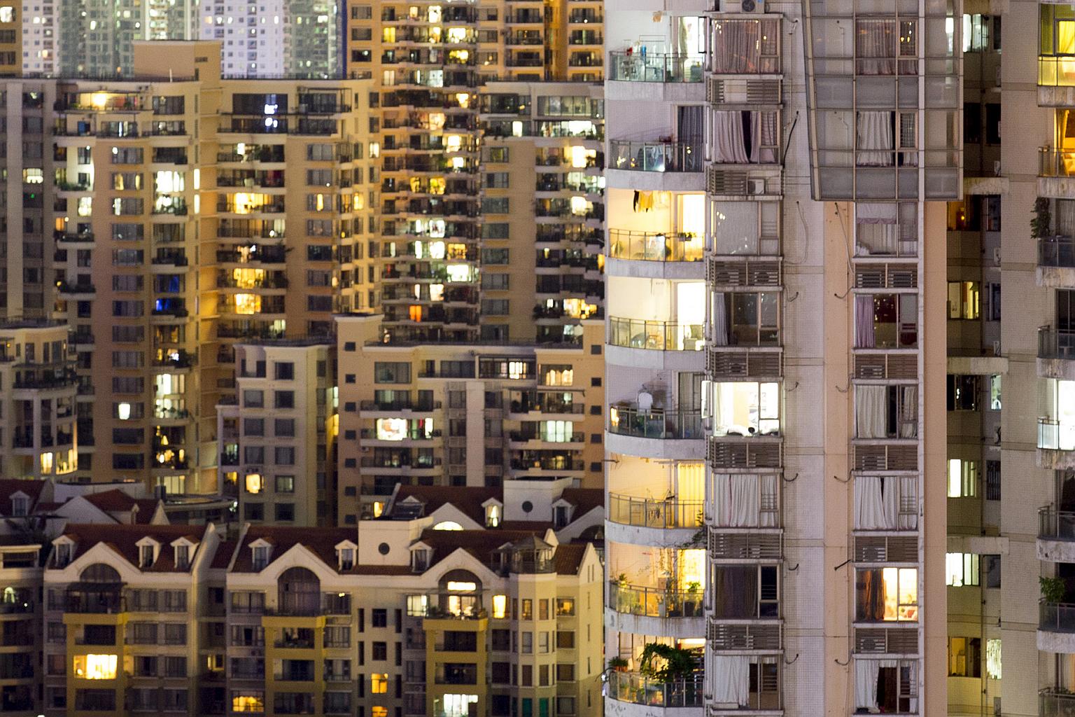 Residential buildings stand illuminated at night in the Nanshan district of Shenzhen, China.
