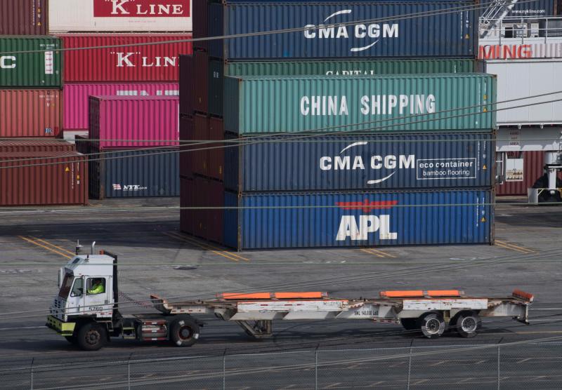 A truck passes by shipping containers at the Port of Los Angeles, after new tariffs on Chinese imports was imposed by US President Trump, in Long Beach, California on Sept 1, 2019.