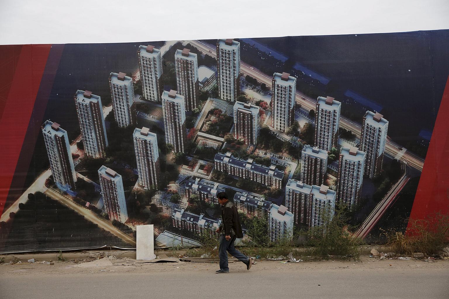 A man walking past a wall at a construction site for a new residential compound in Tianjin on Oct 18.