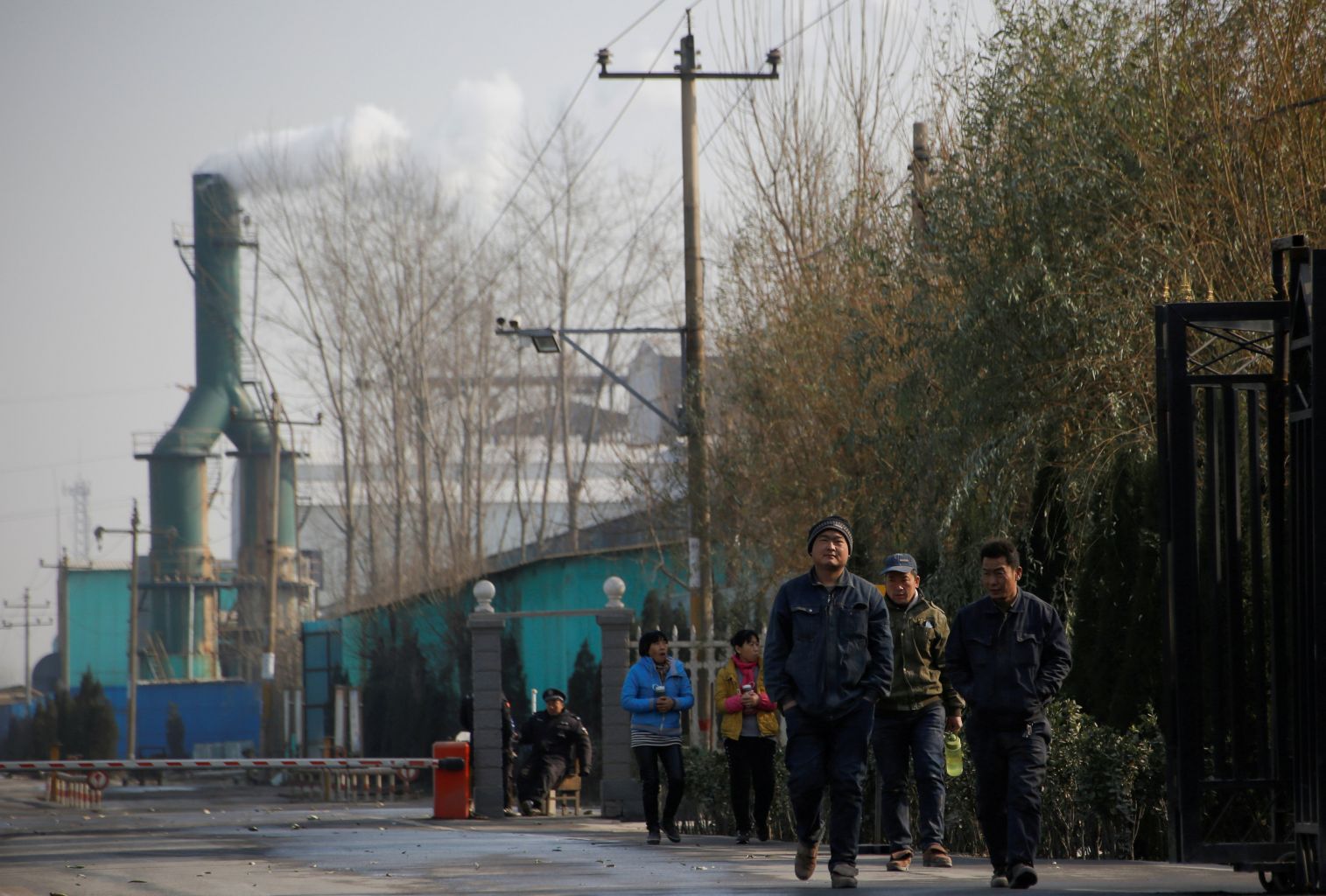 Smoke billows from a chimney as workers leave a factory in Hebei province, China.