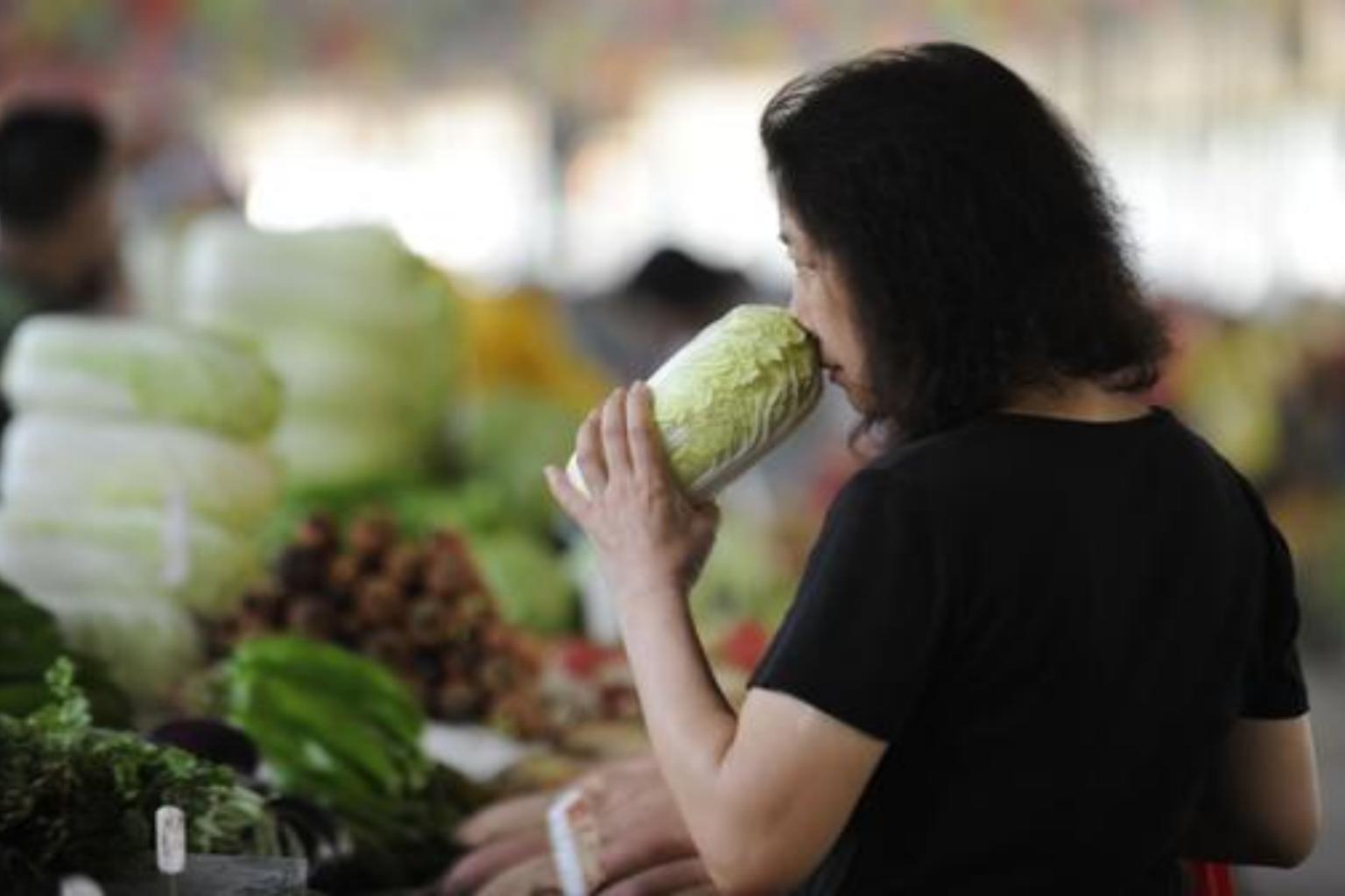 A woman selecting vegetables at a market in Beijing.