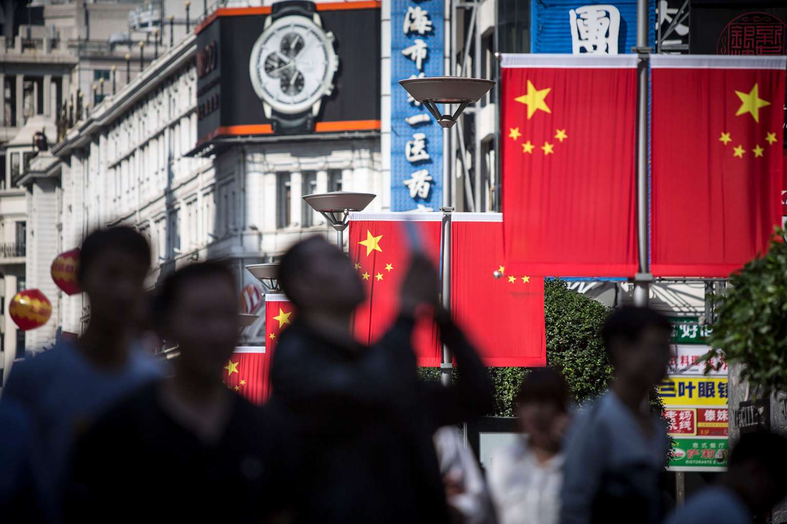 Pedestrians walk past Chinese national flags displayed along the Nanjing Road pedestrian street in Shanghai.