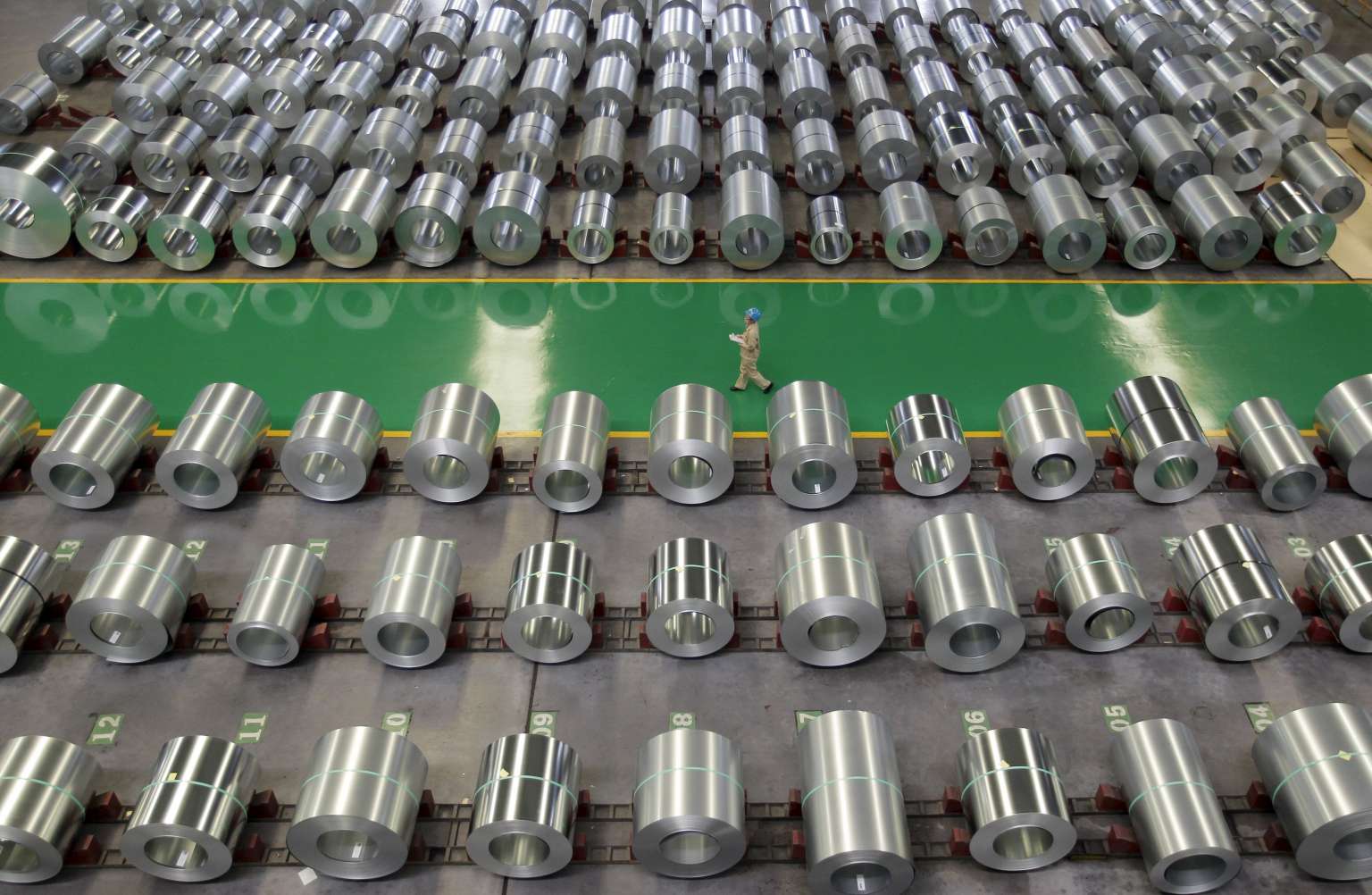 An employee walks past columns of steel at a steel production factory in Wuhan, in this August 2, 2012 file photo.