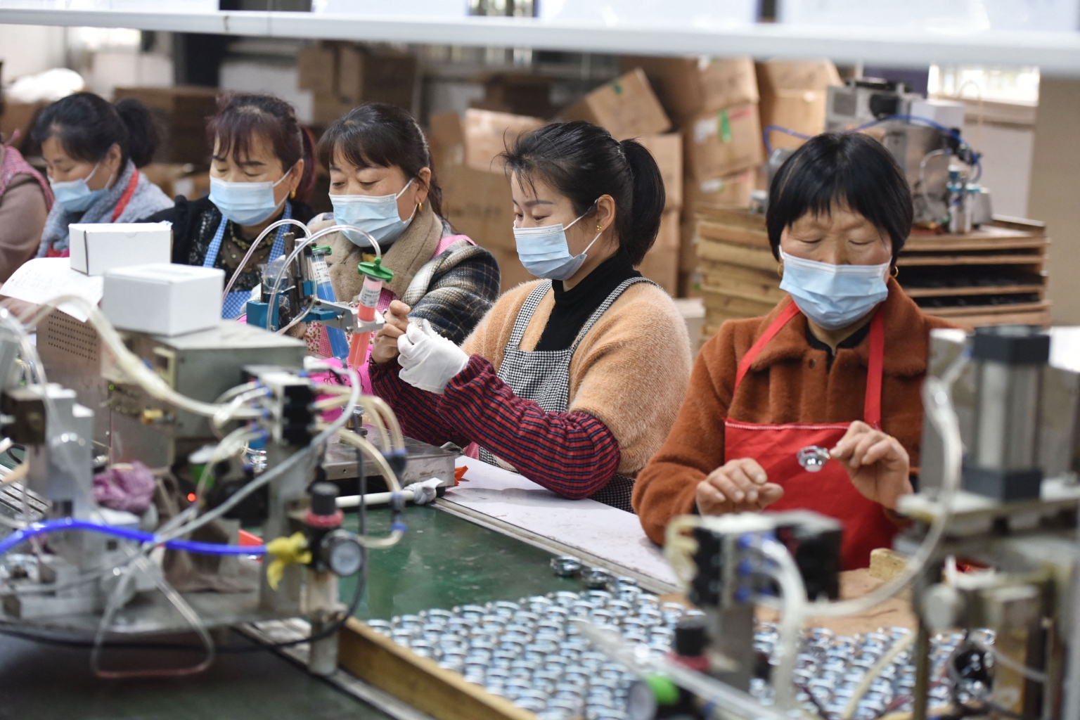 An assembly line producing speakers at a factory in Linquan county, Anhui province, China, on March 31, 2022.