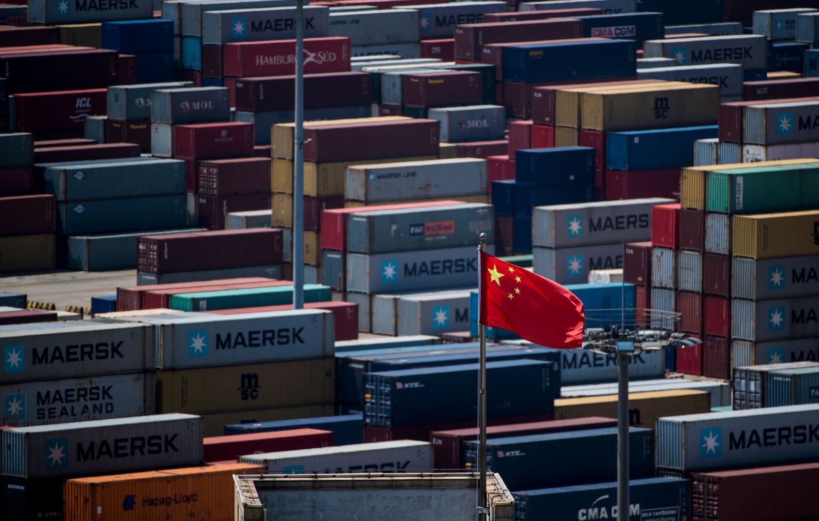 File photo of a Chinese flag in front of containers at the Yangshan Deep-Water Port, an automated cargo wharf, in Shanghai.