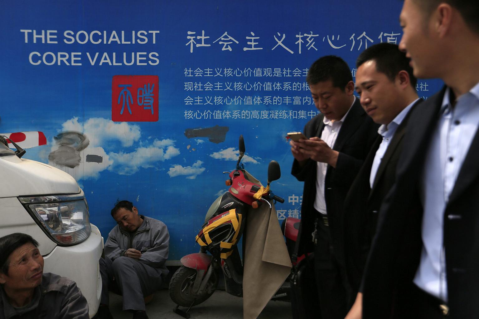 Chinese white collar workers walking past construction workers in the Central Business District area in Beijing on April 15, 2016.
