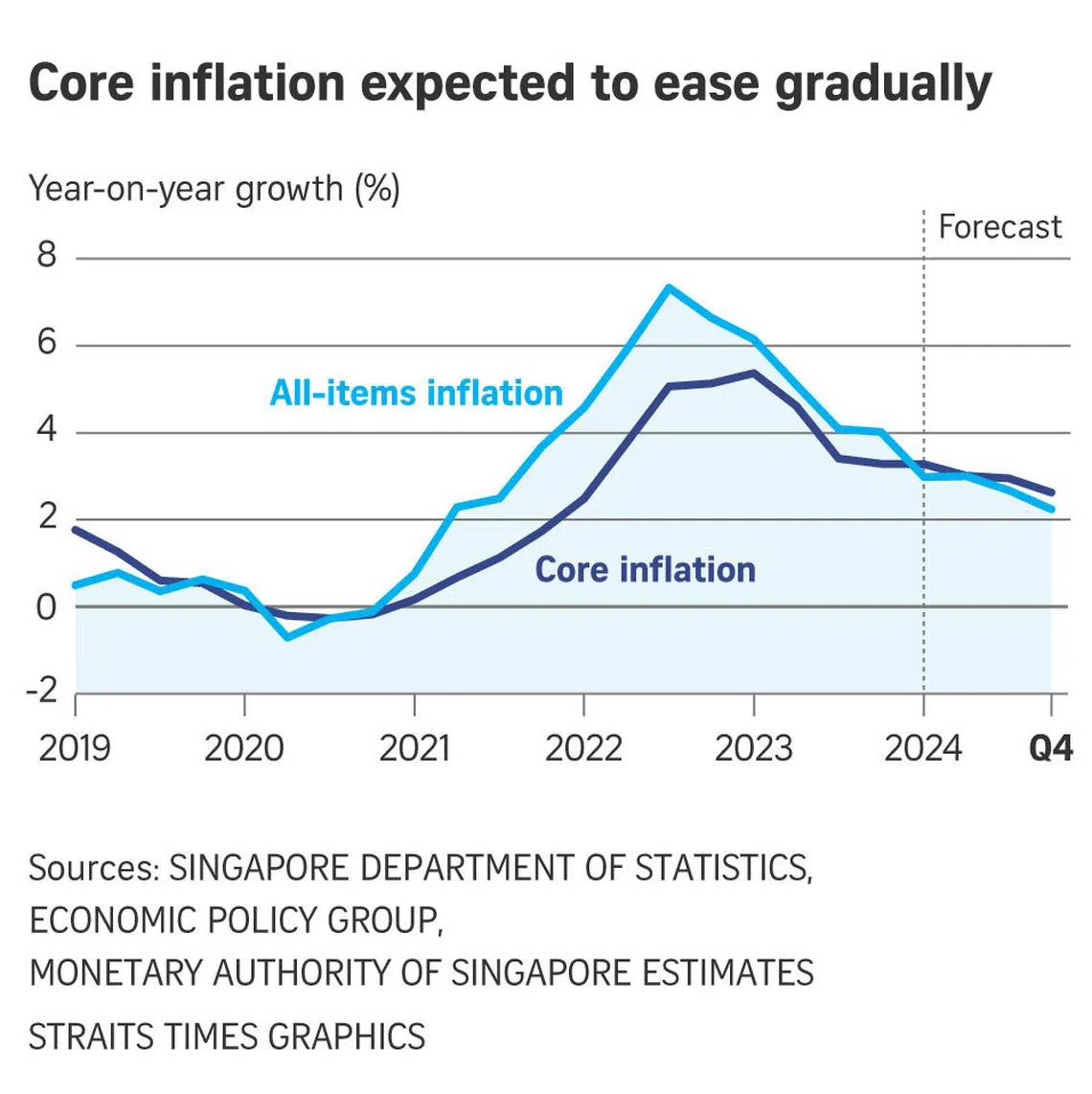For 2024 as a whole, MAS maintained its forecast for core inflation and headline inflation to average at 2.5 per cent to 3.5 per cent. Excluding the transitory effects of the increases in goods and services tax (GST), core and headline inflation are expected to come in at 1.5 per cent to 2.5 per cent.