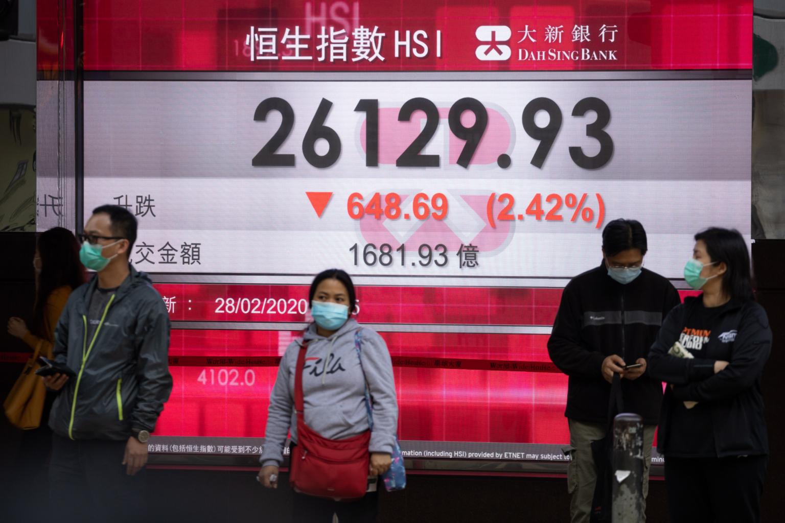People walk past an electronic display showing the closing figure of the Hang Seng Index in Hong Kong, on Feb 28, 2020.