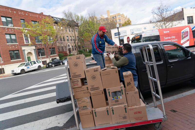 Workers unload food items in front of the Best World supermarket on April 1, 2020 in Washington.