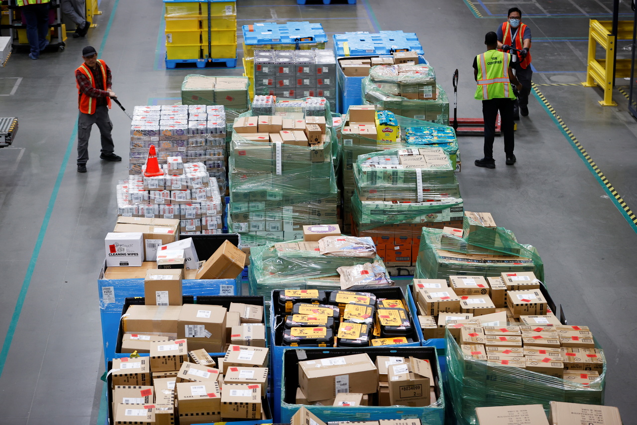 Workers move goods during operations on Cyber Monday at Amazon's fulfillment center in Robbinsville, New Jersey, US on Nov 29, 2021.