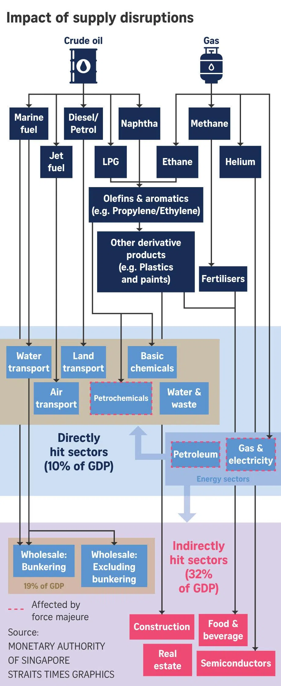 The impact from disruptions to critical imported raw materials has so far been concentrated in the chemicals industries, evidenced by a wave of force majeure declarations across Asia, including Singapore.
