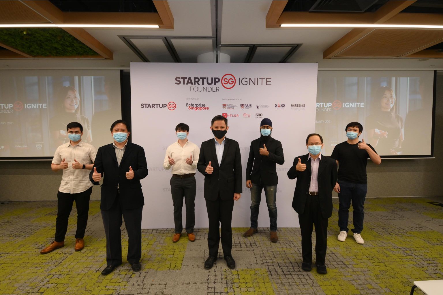 Trade and Industry Minister Chan Chun Sing with the winners of the Founder IGNITE, a series of pitch events organised by Enterprise Singapore.