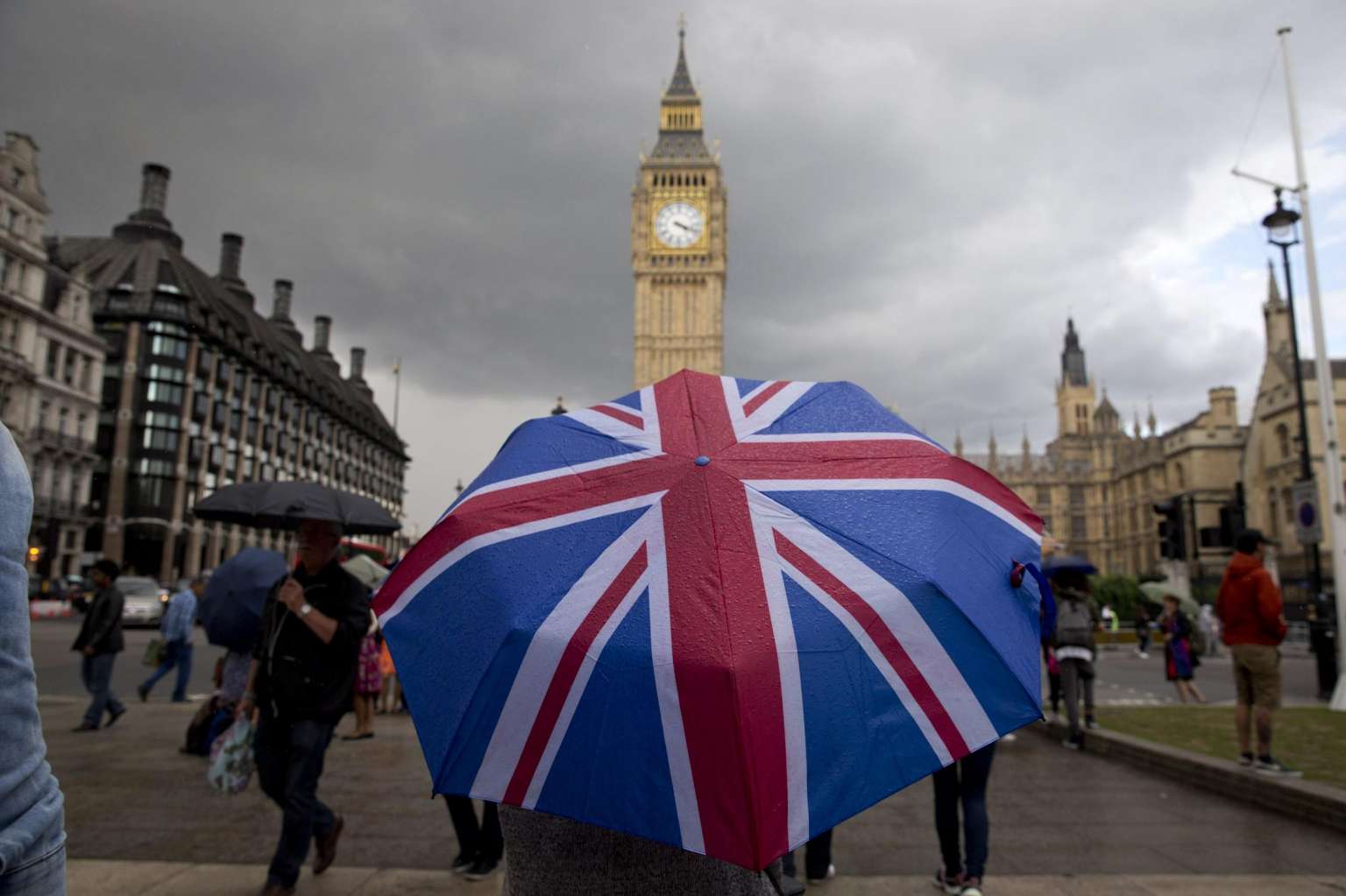 A pedestrian shelters from the rain beneath a Union flag themed umbrella near the Big Ben clock face in the UK.