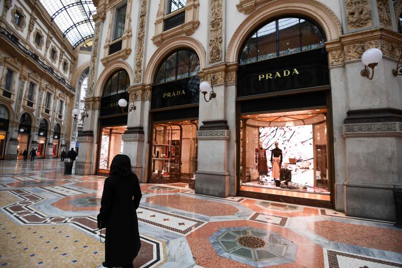 A woman walks by a store of luxury brand Prada in Galleria Vittorio Emanuele II on Feb 29, 2020 in central Milan, northern Italy.