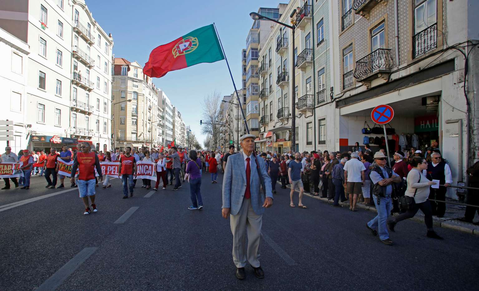 A man holding a Portuguese flag at a May Day march by the CGTP union in Lisbon, Portugal. The country has been chastised by the European Union for breaching EU public spending rules.