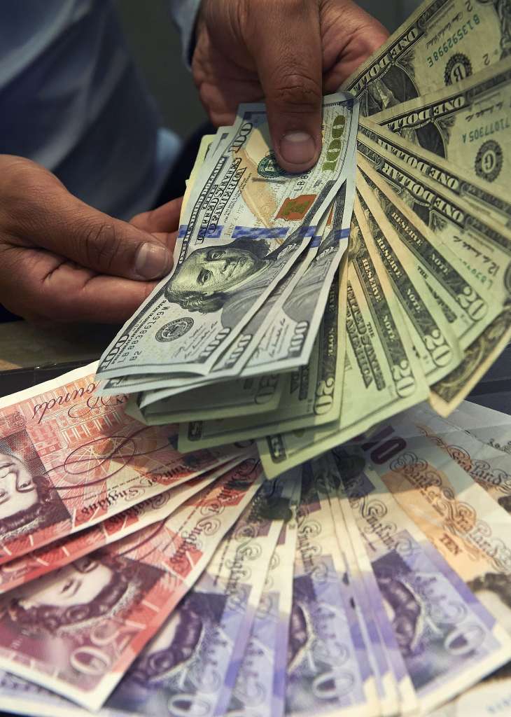 A cashier displays multiple denomination US dollar and British pound Sterling bank notes in a currency exchange store in central London on Oct 4, 2016.