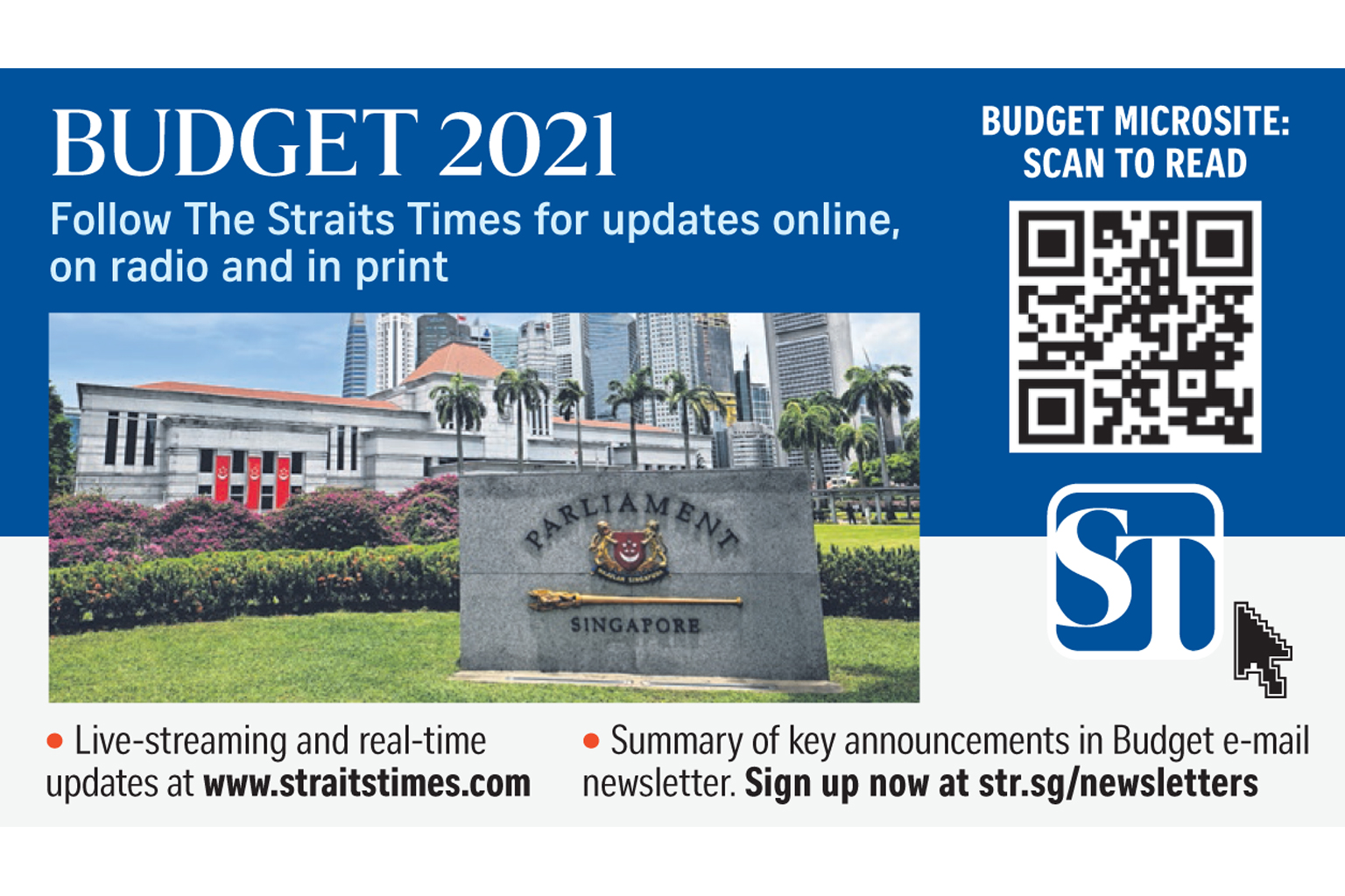 There will also be live-streaming of his speech and a live blog on the ST website, as well as a Budget microsite and updates on ST's Facebook, Telegram and Twitter accounts.