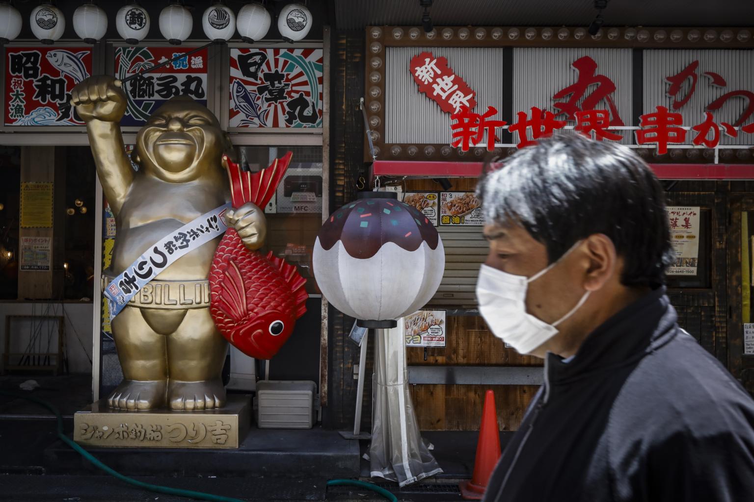 A man walks in front of rows of closed shops and empty restaurants in Osaka on May 21, 2020.